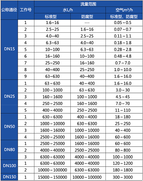 1、測(cè)量范圍:水(20℃)1-200000 l/h;空氣(20℃,0.1013MPa)0.03-4000m3/h;參見流量表,特殊流量可訂制