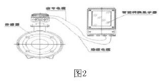 化工污水管道流量計(jì)是由流量傳感器和轉(zhuǎn)換器(也叫顯示器)兩大部分組成。測(cè)量管上下裝有激磁線圈,通激磁電流后產(chǎn)生磁場(chǎng)穿過測(cè)量管,一對(duì)電極裝在測(cè)量管內(nèi)壁與液體相接觸,引出感應(yīng)電勢(shì),送到轉(zhuǎn)換器。激磁電流則由轉(zhuǎn)換器提供。如圖2所示: