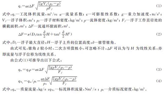 流量計垂直安裝在管道上,流體自下向上流經錐管,浮子在P1、P2差壓作用下產生上升或下移,當浮子此差壓(P2-P1)與浮子重力G、浮力F、粘滯力合力平衡時,處于平衡狀態(tài)。建立方程并推導(可參考相關專業(yè)資料,此處省略),忽略粘滯力影響,假設流量系數為常數,可得出浮子位移與流量成線性對應關系。浮子流量計的流量方程為: