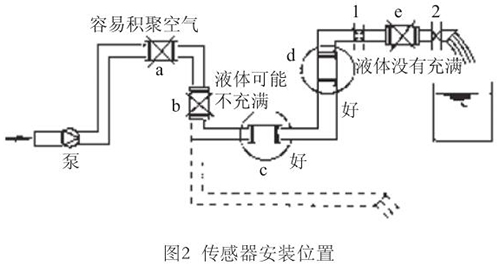 液體流動方向必須與傳感器殼體上箭頭方向一致。對于能正反向測量的智能電磁流量計,若方向不一致雖仍可測量,但設(shè)定的顯示流動正反方向不符,必須改正之。若拆傳感器工作量大,也可改變傳感器上箭頭方向和重新設(shè)定顯示儀表符號。管道未充滿液體主要是管網(wǎng)工程設(shè)計或傳感器安裝位置不妥,使傳感器測量管內(nèi)不能充滿液體。應(yīng)采取措施,避免安裝如圖2所示a,e位置和以虛線管排放時b位置,改裝到c,d位置。