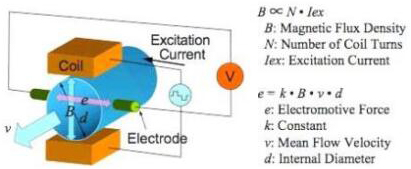 使用管道式電磁流量計(jì)測量的液體流量必須導(dǎo)電是非常重要的。法拉*定律表明,信號電壓(E)取決于平均液體速度(V),導(dǎo)體的長度(D)和磁場強(qiáng)度(B)。因此,將在管的橫截面中建立磁場。