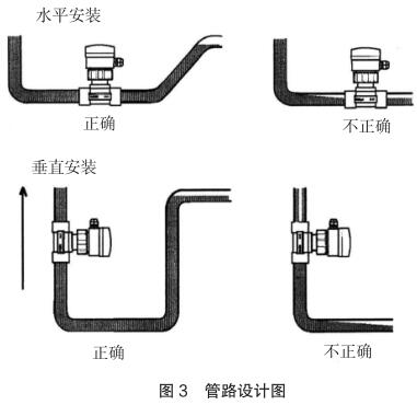 現(xiàn)場(chǎng)安裝時(shí)應(yīng)注意遠(yuǎn)離可能對(duì)其產(chǎn)生干擾的大型設(shè)備,防止長期的熱輻射和其他如磁場(chǎng)直射等環(huán)境影響。為確保高測(cè)量精度和較好的零點(diǎn)穩(wěn)定性,進(jìn)行校正前,智能型電磁流量計(jì)應(yīng)裝入工藝介質(zhì)中至少 24 小時(shí)電極鈍化。安裝的管路設(shè)計(jì)應(yīng)確保管道始終充滿流體,防止測(cè)量誤差,管路設(shè)計(jì)圖見圖 3。