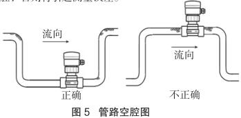 測(cè)量流向取決于智能型電磁流量計(jì)的安裝方位,將智能型電磁流量計(jì)在接頭上旋轉(zhuǎn) 180 度即可反向。正流向時(shí),智能型電磁流量計(jì)的突耳應(yīng)在上游方向。流量顯示總是正的,而累加器可以根據(jù)流向增加或者減少。安裝中確認(rèn)管路設(shè)計(jì)不允許在介質(zhì)中產(chǎn)生氣泡或空腔,否則將引起測(cè)量誤差(見圖 5)。