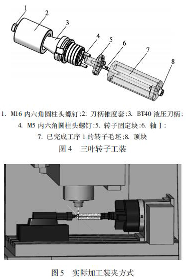 目前量產(chǎn)中的轉(zhuǎn)子都是型材毛坯,采用成型砂輪磨削或者定制成型銑刀進(jìn)行加工轉(zhuǎn)子曲面。這種加工方式工藝成熟,適合大批量生產(chǎn),而且有利于轉(zhuǎn)子線型的技術(shù)保密,但加工方式在研發(fā)試制中應(yīng)用試制加工周期會很長,而且成本很高,不適合單件或小批量試制。為此,筆者基于四軸立式加工中心,結(jié)合三葉轉(zhuǎn)子加工工藝提出一種工裝,如圖 4所示。將這套工裝定位在立式加工中心四軸回轉(zhuǎn)中心上,加工裝夾方式如圖 5 所示。用機(jī)床尾軸頂住轉(zhuǎn)子來增強(qiáng)加工剛性避免切削時(shí)產(chǎn)生震顫。