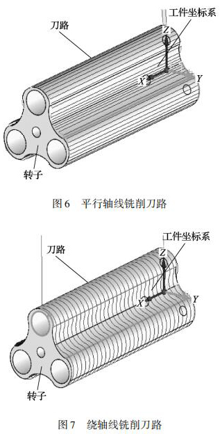 三葉轉(zhuǎn)子的曲面是由多條直線組成的直紋面,加工三葉轉(zhuǎn)子這種高精度的直紋曲面必須采用四軸或五軸聯(lián)動的數(shù)控機(jī)床。三葉轉(zhuǎn)子的銑削方式有刀具路徑平行軸線銑削、繞軸線銑削兩種刀具路徑。平行軸線銑削原理為: 刀具在轉(zhuǎn)子曲面上沿 X軸從轉(zhuǎn)子的一端移動到另一端銑出一條直線,銑削下一點(diǎn)位時(shí)旋轉(zhuǎn) A 軸 Z 軸聯(lián)動再次從轉(zhuǎn)子一端銑削到另一端,采用往復(fù)銑削直到完成整個(gè)轉(zhuǎn)子曲面,刀具路徑如圖 6 所示。繞軸線銑削原理為: 刀具在轉(zhuǎn)子曲面上 AZ 軸聯(lián)動刀具繞 A 軸軸線銑削,銑削下一點(diǎn)位時(shí)移動 X 軸,再次 AZ 軸進(jìn)行聯(lián)動銑削,采用往復(fù)銑削直到完成整個(gè)轉(zhuǎn)子曲面,刀具路徑如圖 7 所示。由于繞軸銑削需要 AZ 軸聯(lián)動切削,而數(shù)控機(jī)床可以達(dá)到的進(jìn)給率是由*慢的軸決定的,所以,這種刀具路徑在精加工高速銑削時(shí)并不適用。
