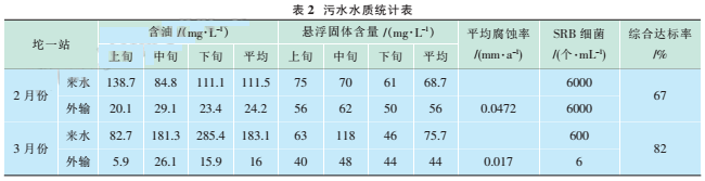 2011年2月坨一站來水含油平均183.1mg/L,外輸含油平均16mg/L,懸浮固體平均8.3mg/L,平均腐蝕率0.017m1m/a,SRB細(xì)菌平均6個(gè)/mL。只有懸浮固體含址超標(biāo)。